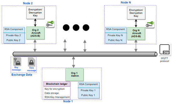Our goal is to explore how blockchains can protect the sharing of sensitive data. To be more specific, we want to highlight a high-level blockchain-based concept that offers a decentralized nature for flight information, particularly for enabling blockchain technology for key exchange and the positioning of information storage. Figure 6 shows the blockchain network topology for key and data exchange. Node 1 is considered as the administrator and thus can add each node to the network and assign private and public keys to each node for data exchanges. Other nodes use the public key of node 1 to encrypt data based on the RSA scheme and publish it via the MQTT protocol to the admin, Node 1, which receives the information and decrypts the data via an RSA private key, and then the data is stored in the blockchain nodes. In addition, an FFX encryption/decryption key is encrypted by admin node according to each node’s corresponding public key, and it is published to the node. Thus, every node receives the key via a secured channel.