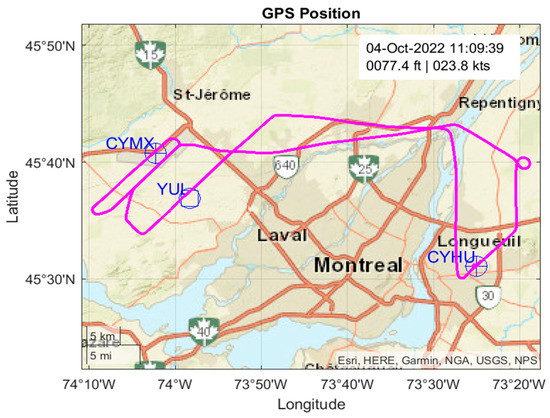 Entropy measurements were performed on both plain data and encrypted data of real flight tests according to ADS-B Out logs. This flight test was performed in a light aircraft (Cessna C-172) flying from Saint-Hubert (CYHU) Airport to Mirabel (CYMX) Airport, as shown in Figure 7 [30].