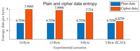 Figure 8 illustrates plain and cipher data entropy for various scenarios. For the 14-byte experiment, the cipher data produced an entropy of 7.9985 bits per byte, whereas the plain text messages had an entropy of 6.7036 bits per byte. These results are similar to the experimental results found by Finke et al. [12]. Moreover, as the cipher data length decreases, the entropy value decreases accordingly. A low entropy value signifies that encrypted data is more vulnerable to possible attacks.