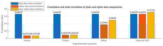 Apart from entropy, the serial correlation of plain and cipher data and the correlation between plain and cipher data are extracted from ADS-B Out flight information, both of which are presented in Figure 9. As revealed in Figure 9, there is a strong serial correlation among the plain data, while the cipher data serial correlation value has an inverse relation with the length of the cipher data. More specifically, the cipher data’s serial correlation value with longer data length is less than its correlation with shorter data size. As expected, plain and cipher data correlation follows the same trend as cipher data serial correlation. Therefore, a higher correlation value, particularly in the case of ICAO encryption, is more vulnerable to codebook attacks.
