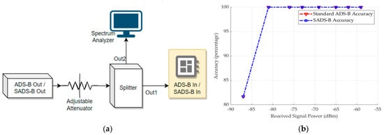 The second experiment was performed to evaluate both standard ADS-B In and SADS-B In signal sensitivity. Figure 10a is a diagram of the test bench designed to evaluate signal sensitivity [30]. As the block diagram illustrates, the ADS-B Out generates ADS-B signals, which are then weakened by a variable attenuator. Next, a splitter provides two signal outputs with the same signal strength, Out1 and Out2. Out1 is used as the input of ADS-B In and Out2 is used as the spectrum analyzer input for signal power measurements. The same test is done for SADS-B. The graph in Figure 10b shows that there are no changes in either standard ADS-B’s or SADS-B’s sensitivity criteria. The Accuracy is calculated based on the following formula: