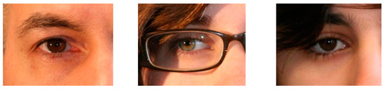 For our experiment, we have chosen the UBIPr dataset, which has been publicly available since 2012 and was created by Padole and Proenca [28]. It facilitates benchmarking our results against earlier published work in this domain of periocular biometrics. A few examples of images have been illustrated in Figure 2. The total count of images accessible is 10,252, which have been stored in .bmp format and come from 342 individuals. The acquired images were taken with a Canon E05 5D camera and belong to the visible range of the electromagnetic spectrum. These images vary in the subject’s distance from the camera, ranging from 4 m to 8 m, in increments of 1 m. The corresponding image resolution varies from 1001 × 801 pixels to 501 × 401 pixels. They also have variations of 0, 30, and −30 degrees in terms of pose and gaze. The subjects chosen based on gender are in the ratio of 54.4% male and 45.6% female.