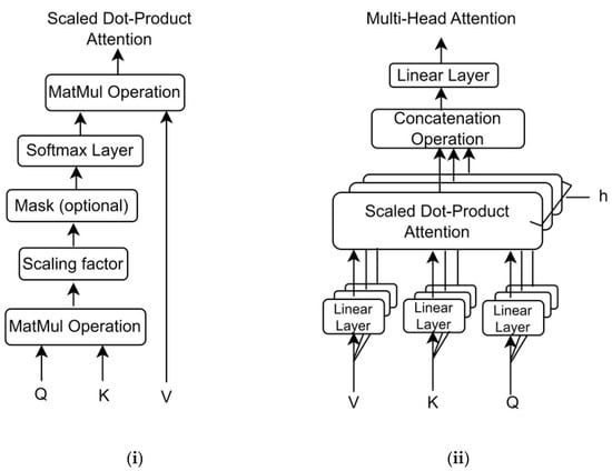 Self-attention is a sequence-to-sequence procedure in which a sequence of vectors is fed into the system, and a sequence of vectors emerges. The self-attention process enables inputs to engage (‘self’) and decides who gets more significant attention. The context of appearance is emphasized in this process. The outputs are aggregates of these attention scores. Transformers are centered on attention mechanisms, referred to as multi-head attention. The scaled dot product attention as well as multi-head attention mechanisms are represented in Figure 3 [25].
