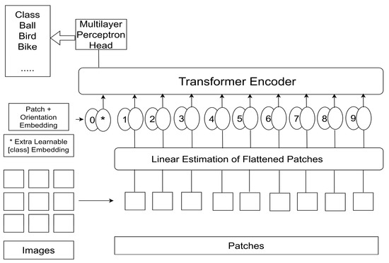 Pixels are the basic unit of analysis for images. ViT, on the other hand, calculates associations between numerous accompanying pixels in minuscule areas of an image (for instance, 32 × 32 pixels) rather than calculating relationships between every pair of pixels in a typical image. Units (with positional embeddings) are created in succession. The embeddings can be computed in vector form. Every segment is grouped as a sequence in linear form, sent to the transformer, and multiplied by the embedding matrix. In classification problems, the class token is essential. The single input to the final MLP head is a unique token [26]. The transformer encoder converts input tokens in the most typical image classification architectures. The decoder part of the classic transformer layout is also used in a few applications [27].