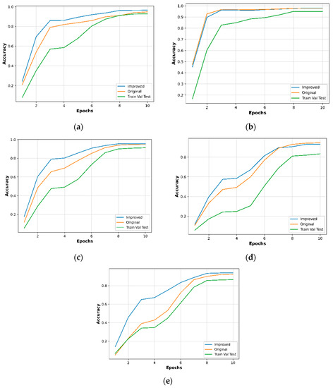 As illustrated in Figure 7a, the accuracy increases rapidly in a linear fashion up to 3 epochs for the different models with an accuracy from 60 to 80% and then stabilizes around 80 to 90% from epoch 8 to 10. An appreciable improvement is observed in the proposed ViT architecture (ViT-T/16) in the CV Score, which is 96.196 as compared to the original ViT architecture, which is 94.821. From Figure 7b, we observe that in the first two epochs, a steep increase in accuracy is observed and later it flattens for the next eight epochs. There was no significant difference noted in the original ViT architecture as compared with ViT-B/16, though there was an improvement when compared in the ViT model trained based on train-val-test. From Figure 7c, we can observe that the accuracy increases steeply up to three epochs, and then linearly through epoch 7, and flattens later. There is no significant difference found in the ViT original and the ViT-S/16 architecture, though it is significant when compared in the ViT model trained based on train-val-test. We can contemplate from Figure 7d, emphasizing ViT-B/32, that as compared with the other models, there is not a steep increase in the accuracy with the number of epochs; instead, it is more or less piecewise linear for the first eight epochs and then flattens. It can be seen from Figure 7e that the proposed architecture (ViT-S/32) performs better as compared with the other two models for all ten epochs. There is a piecewise linear increase for seven epochs and later it is constant.