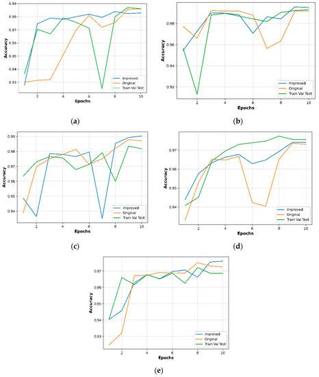 From Figure 8a, we observe that there is some randomness in the values of accuracy for the train-val-test model, but there is a steep increase in the proposed architecture (ViT-T/16) in the first two epochs, and later it flattens with little variation. It is also seen that there is an improvement in the overall accuracy after 10 epochs for all the techniques. From Figure 8b, we see that after the first three epochs, the accuracy falls in the range of 96 to 98%. Though after seven epochs, there has been a dip observed for the model based on the original ViT architecture (ViT-B/16), but it also stabilizes with more than 98% accuracy later. In Figure 8c, it can be seen that the proposed architecture (ViT-S/16) showed a lot of variations in the accuracy as compared with the other techniques, though the final accuracy after 10 epochs was 98.664. The accuracy does not flatten for different epochs, which can also be observed in that fashion due to the scale on the Y axis. From Figure 8d, we can see that there is a steady increase in the accuracy up to 5 epochs, and then is close to flattening through the next five epochs. For the original ViT architecture (ViT-B/32), though, a large dip can be observed after seven epochs. From Figure 8e, we can observe that there is an increase in the accuracy in a linear fashion for the first three epochs, and later for all the remaining models. However, the values are not varying much, with a steady rise after ten epochs for the ViT-S/32-based models.