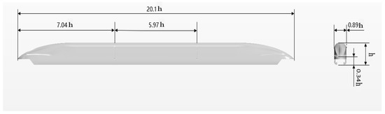 In this study, a 600-km/h magnetic levitation test train was developed in China as the object of study. The train model was scaled down to 1:20 prior to the numerical simulation because the full y+ wall treatment was used and the y+ needed to be controlled to be less than 1 or greater than 30. Figure 1 illustrates the training model. At full scale, the maglev train has a height of h = 4.14 m, cross-sectional area of 11.95 m2, T-shaped track beam with a track surface of 1.09 m from the ground, and a bottom surface at 0.3 m from the ground. Using the maglev train height as a benchmark for data in this study for dimensionless processing, the car length is 20.1 h, car width is 0.89 h, head car is 7.04 h, middle car is 5.97 h, and nose height is 0.34 h. The entire car is composed of four parts: frame, wheel assembly, outer shell of the rolling stock, and an on-board test system [20].