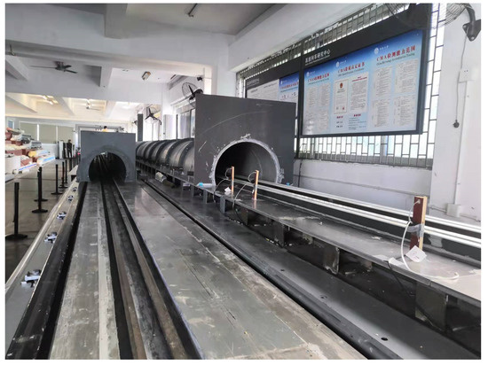 In the moving model tests, the maglev train and tunnel models were scaled down to 1:20. Therefore, in the numerical simulations, the same scaled-down model was used for the maglev train and tunnel to ensure maximum consistency between the numerical simulation test setup and moving model test setup. Due to the rapid changes in test pressure of a moving model locomotive, it is necessary to ensure that the sensing and measurement channels have sufficient response speed. The sensor signal was amplified in two stages and filtered by second-order low-frequency filtering to eliminate high-frequency spurious interference. The entire range output was fed into a high-speed A/D converter for acquisition as a standard voltage signal of 0–5 V. Each pressure signal channel has an independent circuit structure and A/D converter, and synchronous sampling is controlled by the same time-based signal, thereby ensuring fast data acquisition and consistency in time and space for each channel. Figure 7 shows the scenario of the dynamic model for measuring pressure experimentally.