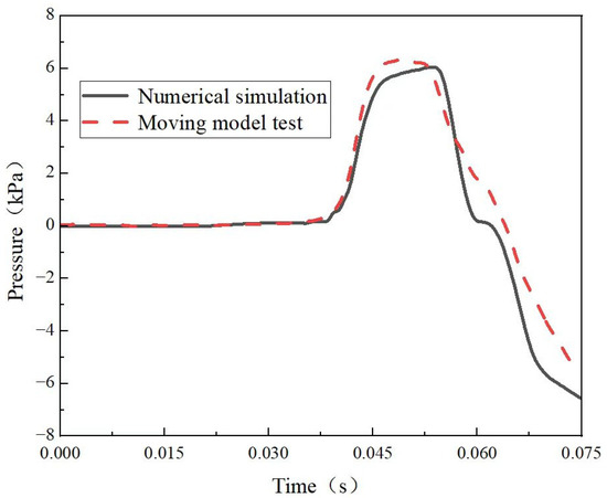 To verify the accuracy of the numerical simulation results, the pressure–time curves obtained from the numerical simulation measurements were compared with the moving model test results using the conventional tunnel in the programmer table as an example. To ensure consistency between the experimental and computational boundary conditions, slip-ground boundary conditions were used for the numerical simulations. Moving model tests were conducted on the newly built 600-km/h high-speed maglev train moving model test platform at the High-Speed Train Research Center of Central South University. This is the world’s largest test platform and the only “train pneumatic moving model test system”, with CMA and CNAS (certificate number: CNAS L10220) qualifications [22,23,24].