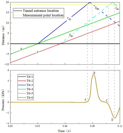At 0.03 s, the head of the train enters the tunnel. The air in front of the train is compressed, leading to the generation of the compression wave and forward propagation at the speed of sound, reaching the measurement point at 0.0848 s, and resulting in an increase in pressure at A. The compression wave then reaches the tunnel entrance, and the expansion wave is generated and arrives at the measurement point at 0.0894 s, resulting in a decrease in pressure at B. At 0.1097 s, the expansion wave reaches the measurement point, and the measured pressure decreases again. When the expansion wave reaches the tunnel exit, it generates a compression wave, which propagates towards the tunnel entrance, causing a pressure rise at D. During this process, the pressure profiles monitored at the different measurement points T6-1 to T6-6 overlap almost exactly, which is consistent with the results obtained by Liu et al. [24] for a 350-km/h train. This indicates that significant one-dimensional effects still dominate the tunnel when the model used in this study is operated at 600 km/h. Therefore, in subsequent studies, it is sufficient to set up only one monitoring point for different sections, and discussion of the magnitude of the effect of different measurement points on the test results in the same section is not required.