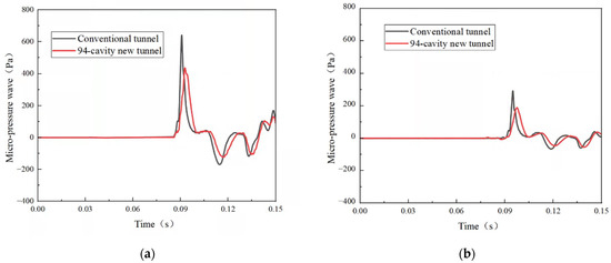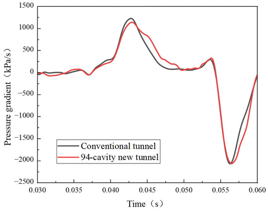 The Helmholtz resonator is observed to be effective in reducing the micro-pressure wave amplitude. This is determined by comparing the micro-pressure wave amplitude data measured at measurement points M-1, M-2, and M-3 in the conventional tunnel and new 94-cavity tunnel. According to the CEN European Standard [30], the values measured at 20 m and 50 m at the exit of the tunnel are the micro-pressure wave amplitude values (i.e., at measurement points M-2 and M-3). As shown in Figure 11 and Table 3, the new 94-cavity tunnel with Helmholtz resonators shows a 31.87% and 33.23% decrease in the micro-pressure wave amplitude at M-2 and M-3, respectively, when compared with the numerical simulation results of the conventional tunneling scheme. By comparing the initial compressional gradient curves (Figure 12), it can be observed that the initial compressional gradient in the new 94-cavity tunnel exhibits a trend similar to that of the conventional tunnel, but with a 7.06% reduction in amplitude.