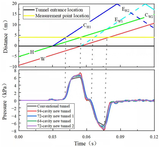 Figure 9 shows the relationship between the instantaneous pressure on the tunnel wall and propagation of the pressure wave when the maglev train passes through the tunnel at 600 km/h. In this figure, H denotes the train head displacement, W denotes the train tail displacement, C denotes the compression wave, and E denotes the expansion wave. Subscript H denotes the wave due to the evolution of the compressional wave induced by the entry of the train head, and W denotes the wave due to the evolution of the expansion wave induced by the entry of train tail, with the subscripts increasing when the wave is reflected. T6-1 to T6-6 are six measurement points in the same tunnel section that are arranged at different positions around the tunnel wall.