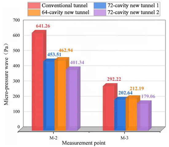 The data measured at measurement points M-1, M-2, and M-3 for the original scheme, 72-cavity new tunnel, and new 64-cavity tunnel were compared (see Table 5) and calculated as follows:
