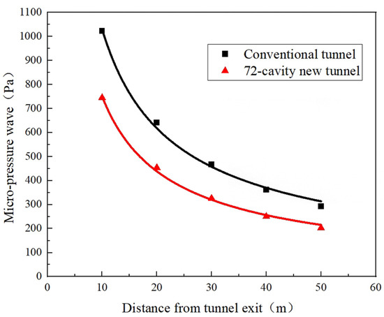 - In the 72-cavity new tunnel 1 scheme, the micro-pressure wave amplitude at the exit of the tunnel was approximately inversely proportional to the 0.78th power of the distance from the exit end of the tunnel, which approximates the fitted curve of the original tunnel scheme. This indicates that the presence of the Helmholtz resonator only reduces the initial compressional wave gradient and micro-pressure wave amplitude, and it does not affect the formation mechanism.