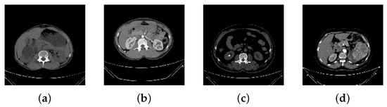 Sample Images from the Dataset. (a) Cyst, (b) Normal, (c) Stone, (d) Tumor.