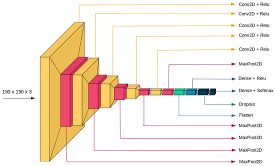 In the proposed customized CNN model (Figure 3), all five convolution layers were followed by max-pooling layers. The results of the final max-pooling layers were flattened, followed by a drop-out layer as well as two dense layers. In addition, an L2 regularization (l2 = 0.0001) was used for the last two dense layers to eliminate sparse weighting [52]. In order to visualize the ROI in the CT images more effectively [53], a kernel size of was used. According to Sitaula et al. [54], an ideal stride value of 1 should be used to enhance the medical images, as a greater stride had overlooked the discriminating semantic regions; therefore, the same was used in this study. Furthermore, to prevent the network from over-fitting, the dropout layer was adjusted to 0.2. We concluded the model was lightweight, and the parameters of all the layers are shown in Table 1.