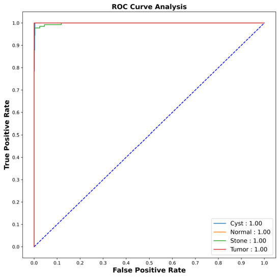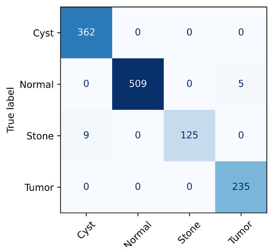 In order to analyze the performance of the suggested model for each class of abnormalities, the precision (99.30 ± 1.55%–99.70 ± 0.64%), the recall (97.90 ± 3.30%–99.90 ± 0.30%), and the F1-score (98.8 ± 1.83%–99.80 ± 0.40%) were measured for 10 folds (Table 4). The foremost F1-score for the cyst class was recorded by the proposed model, demonstrating the model’s superior ability to detect and recognize cysts. As all three categories had an F1-score greater than 98%, the model was also successful in detecting the normal, stone, and tumor categories. In addition, Figure 11 displays the confusion matrix for the correct and incorrect categorizations generated by the model.