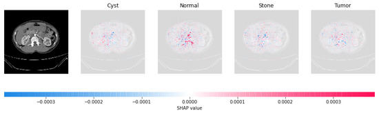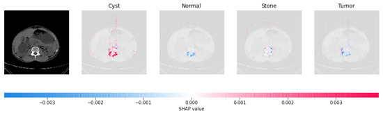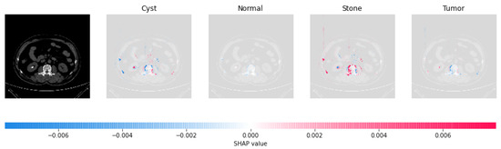 Since it was difficult to directly interpret the mathematical behavior of the CNN model, XAI techniques were applied to the model [60]. Four results were illustrated by the SHAP results for each category (cyst, normal, stone, tumor).Testing images are shown on the left with a transparent gray background behind each explanation.