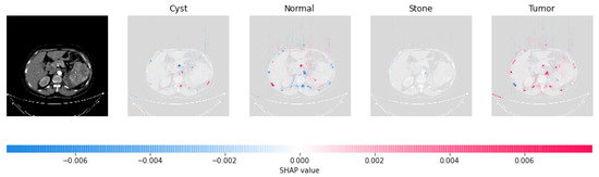 By normalizing the marginal feature values, SHAP assessed the influence of the model features. The scores exemplified the significance of each pixel on a predicted image and were used to substantiate their classification. To obtain the Shapley value, all potential combinations of characteristics of kidney abnormalities were used. Red pixels increased the likelihood of predicting a class once the Shapley values were converted into pixels, while blue pixels reduced the likelihood [58]. The Shapley values were generated by Equation (1).