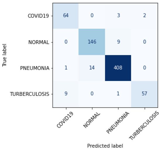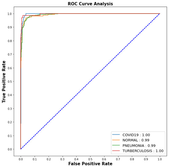 The confusion matrix of the 10th fold is shown in Figure 12. Only 5 COVID-19, 9 Normal, 15 pneumonia, and 10 TB images were misclassified, out of 69, 155, 423, and 67 images, respectively. Figure 13 shows the ROC-AUC curve that indicated the model supported the accurate diagnosis of COVID-19 and pneumonia.