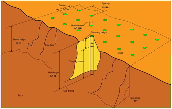 The blasting design parameters from the Mikurahana quarry are as follows. The diameter of vertical and horizontal holes is 65 mm, the space between vertical holes is 2–2.4 m, the length of the vertical hole is 9–9.5 m, the bench height is about 10 m, and the inclination of the vertical hole is 80°–85°. Explosives such as ANFO, water-containing explosives, and electric detonators are the most common type of explosives used in the quarry. All the blasting design parameters of the quarry site are depicted in Figure 3.