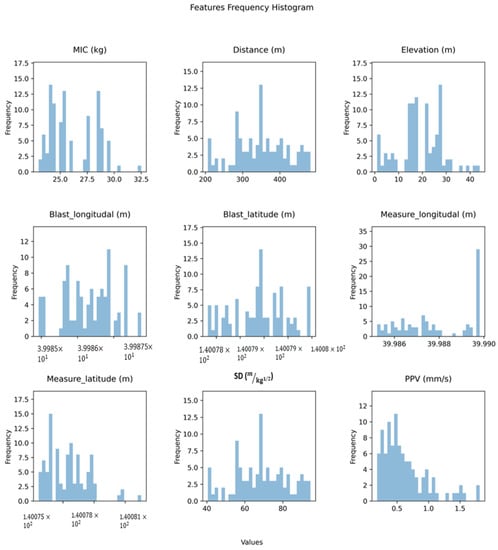 The ground vibration dataset consists of 100 data points. There are eight inputs: the MIC, SD, distance, elevation, blast longitudinal, blast latitude, measured longitudinal, and measured latitude, while the PPV is the output. Table 2 indicates the descriptive statistical analysis of the dataset, and Figure 5 illustrates the frequency histogram of the dataset. The dataset was split into training dataset (80% of the total dataset) and testing dataset (20% of the total dataset). Due to the variation in the dataset in Figure 5, normalization was applied, to avoid overfitting and to increase the model’s learning performance. Equation (5) expresses the formula of normalization.