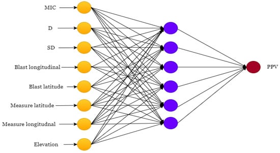 Some researchers, such as Moyadei and Rezaei [33], believe that the feed-forward back propagation (BPNN) algorithm is the most efficient learning technique for multilayer neural networks, among the several algorithms that may be utilized in an ANN (Figure 6). The learning process may be either unsupervised or supervised. Unsupervised is the most common approach for regression and classification problems, and it is used to predict the peak particle velocity (PPV) in this study. The ANN must be trained by analyzing many input and output patterns. The ANN then interprets the observational data into the hidden layer. First, a layer, or layers, of hidden neurons create the weights transmitted by the transfer function of the neurons in the input layer, and then the output layer performs the desired output prediction.