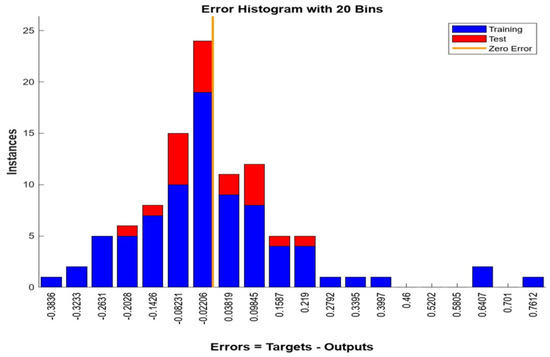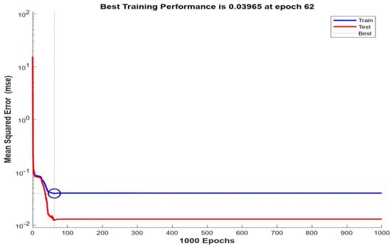 The Bayesian neural network model’s performance was computed utilizing the MSE, RMSE, and R evaluation metrics. Figure 10 demonstrates the regression model’s actual and predicted data distribution. Figure 11 illustrates the model’s learning curve with 1000 epochs; the best performance is at epoch 62, based on the mean squared error. Figure 12 indicates the model prediction error histogram. The proposed Bayesian neural network model was compared with the random forest regression, gradient boosting, decision tree, and k-neighbors regression models, to outline the performance of the BNN model. Table 3 presents the results of the comparison between the models, based on the evaluation metrics. The proposed model is superior to the traditional machine learning methods.