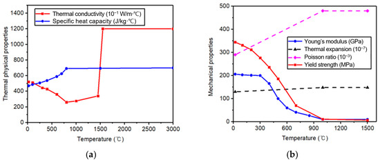 Temperature-dependent material properties of AH36 steel plate: (a) thermal properties and (b) mechanical properties.