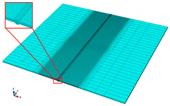 where is the volume heat flux; is the welding velocity; the parameters , , , and describe the dimensions of the heat source; a lag factor defines the position of the heat source at t = 0; and is the fraction of the heat deposited in the front and rear parts, which was = 2 in this simulation. and were 1.33 and 0.67, respectively. Finally, is the magnitude of the heat input expressed by
