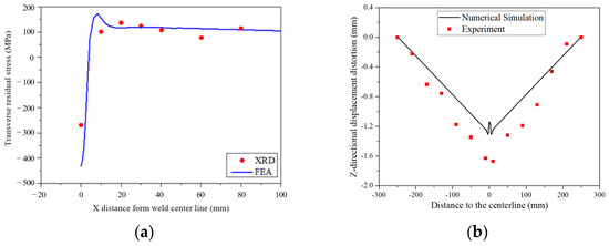 Validation of the experiment data and numerical simulation for: (a) transverse residual stress and (b) Z-directional displacement distribution.