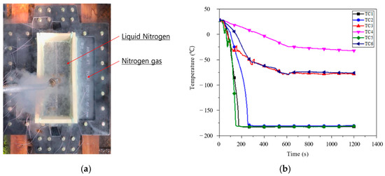 Figure 11b shows the time-dependent temperature relationship under cryogenic liquid exposure at six different measurement points. As shown in the figure, the temperature decreases significantly from thermal shock due to the temperature difference between the ambient temperature at the steel plate surface and the temperature of the liquid nitrogen (−196 °C). Subsequently, the temperature decreases quickly and remains approximately constant until the cryogenic liquid supply is terminated. The thermocouples TC1, TC2, and TC5 eventually reach a cryogenic temperature of −196 °C because they contact liquid nitrogen inside the trough. However, the time required to reach a temperature of −196 °C shows different trends, depending on the location of the thermal couples. TC5 and TC2 reach a temperature of −196 °C in approximately 160 s and 280 s, respectively. In the cases of TC3 and TC6, which are located outside the trough, the temperature is maintained at approximately −75 °C by conduction and convection thermal transmission through the plate. In the case of TC4, the temperature is maintained at about −25 °C due to its position at a relatively long distance from the liquid nitrogen inside of the trough. All temperatures increase rapidly with the termination of the liquid nitrogen supply. Finally, the temperature gradually converges to room temperature in the interval between 4000 s and 5000 s.