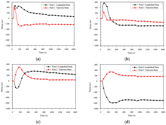 The strain curves in the longitudinal and transverse directions: (a) Point 1, (b) Point 2, (c) Point 3, and (d) Point 4.