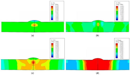 Simulated residual stress components in the weldment: (a) transverse stress, (b) longitudinal stress, (c) normal stress, and (d) von Mises equivalent residual stress.