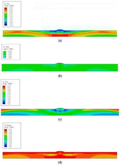 Stress components after liquid nitrogen exposure: (a) transverse stress , (b) longitudinal stress , (c) normal stress , and (d) von Mises equivalent residual stress.