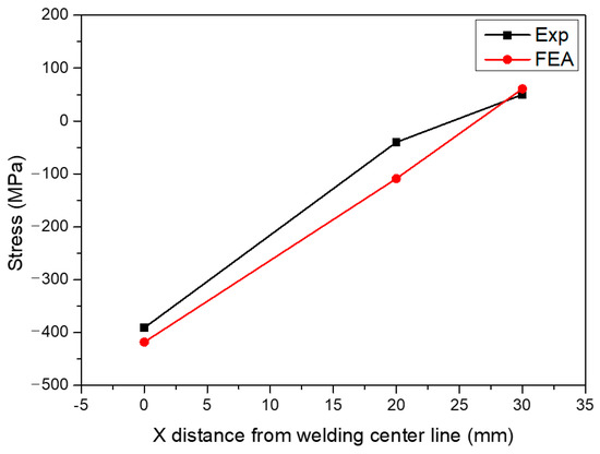 This work measured residual stress after welding and compared the results with the results obtained using the finite element modeling (FEM) approach. Figure 10a compares the results of XRD with the surface transverse stress. Additionally, the Z-directional distortion is also measured and compared between the numerical simulation and the experiment, as shown in Figure 10a. Both comparisons illustrate that the FEA welding analysis reflects the experiment.