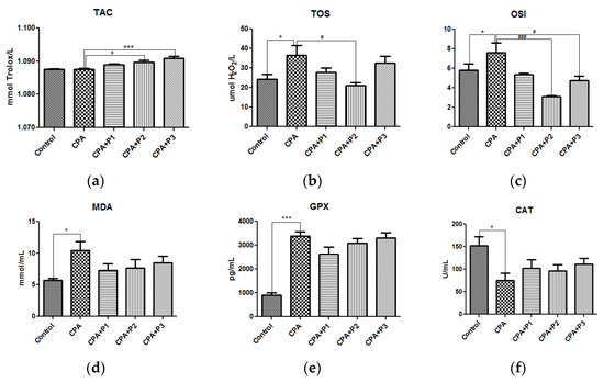 The in vivo antioxidant response of P. sempervirens extract seen in (a) TAC, (b) TOS, (c) OSI, (d) MDA levels, (e) GPX and (f) CAT activities in serum of Control, CPA, and CPA + P1/P2/P3 exposed animals. Data represent mean ± SEM; One-way ANOVA followed by Bonferroni’s Multiple comparison test; * Significant at p < 0.05; *** Significant at p < 0.001—compared with Control group; # Significant at p < 0.05; ### Significant at p < 0.001—compared with CPA group.