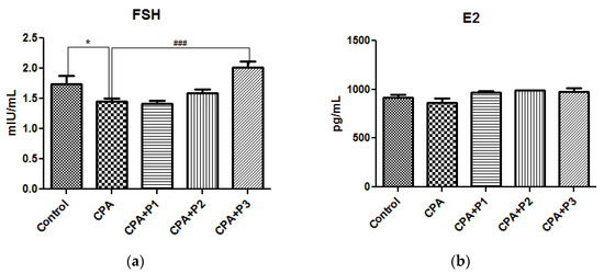 Sex hormone levels in serum—(a) FSH and (b) E2 of Control, CPA, and CPA + P1/P2/P3 exposed animals. Data represent mean ± SEM; One-way ANOVA followed by Bonferroni’s Multiple comparison test; * Significant at p < 0.05—compared with Control group; ### p < 0.001—compared with CPA group.