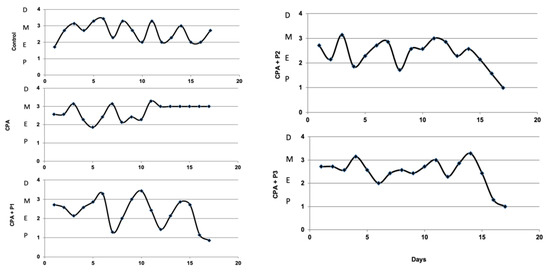The oestrus stages determined by vaginal cytology (pro-oestrus (P), oestrus (E), metoestrus (M) and dioestrus (D)) in Control, CPA, and CPA + P1/P2/P3 groups. The oestrus cycle respects a repetitive dynamics at almost every five days, except the CPA group which blocking in the metoestrus stages is evident after CPA administration.