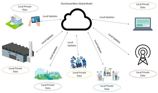 As the computational and storage capabilities of devices in a distributed network grow, local resources can be used on each device. This has led to an increase in interest in federated learning (FL) [,,]. Federated learning is a machine learning technique in which an algorithm is trained on multiple decentralized edge devices or servers using local private data samples without sharing them. It has numerous applications, such as healthcare systems, industry, telecommunications, etc., as shown in Figure 1.