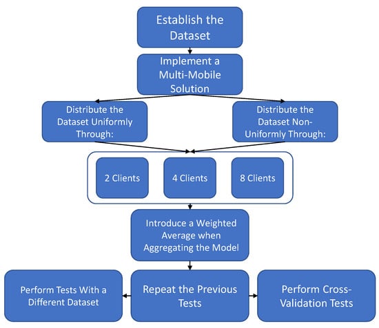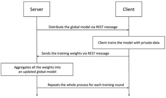 The logic implemented on the server included a function that aggregated the weights coming from the clients and a function to test the updated global model. Figure 4 presents a high-level diagram of the interaction between server and clients in the proposed solution.