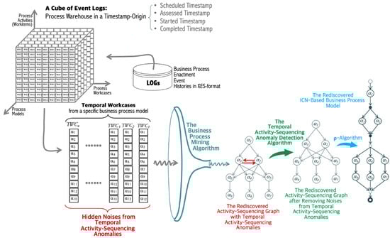 In particular, it assures that the temporal workcases embed a certain quantity of hidden noises that may seriously affect the correctness as well as the quality of the corresponding process-mining algorithms, discovering the correct process models due to all such anomalies caused by the hidden noises. Consequently, we need to build a certain form of anomaly-treatment algorithms that can detect and remove those noises caused by the temporal activity-sequencing anomalies. As can be seen, the right-hand part of the conceptual framework illustrates the procedural algorithms of clearing of temporal activity-sequencing anomalies and noises off from the outcome of the discovery algorithm (The author’s research group has successfully devised an ICN-based process discovery algorithm, the name of which is -Algorithm []). The rediscovered activity-sequencing graph embeds the specific types of anomalies and noises, because the internal structure of the temporal workcases has inevitably no choice but to spawn certain types of noises caused by the temporal activity-sequencing anomalies. The temporal activity-sequencing anomaly detection algorithm proposed in this paper does clear off all those noises from the rediscovered activity-sequencing graph and produces the finalized temporal activity-sequencing graph, from which the -Algorithm eventually rediscovers a corresponding SICN-based business process model.