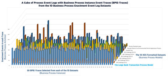 According to the way a process instance is executed, the logging and auditing component of the process enactment engine records its workitem execution events on a log repository, and those logged events are arranged in the form of the corresponding temporal activity-sequence of event logs. Eventually, the temporal activity sequence of each process instance is concretized to the process instance event trace with the conceptual and theoretical basis as the name of temporal workcase model. From the dataset of process instance event traces, it does extract each process instance’s workitem event trace and its temporal workcase with the workcase model. In general, each of the event logs in the process instance event traces is formatted in a tag-based language such as XWELL, BPAF, or XES. Recently, IEEE released a standard tag-based language, XES (Extensible Event Stream), whose aim is to provide designers of information systems a unified and extensible methodology for capturing the systems’ behaviors by using event logs and event streams. For the sake of the experimental analyses, the author prepares a group of process enactment event log datasets, as shown in Figure 2, all of which are available in the 4TU.Center for Research Data [] and are well-fitted and appropriate for carrying out the experimental analyses.