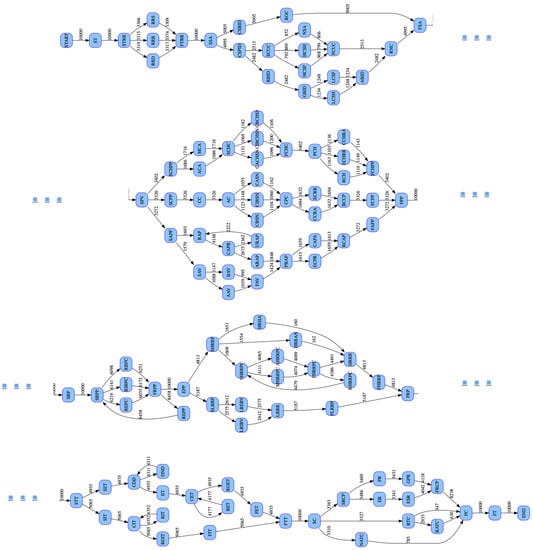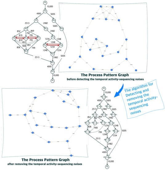 Algorithm 1 describes our algorithmic approach for detecting and removing the temporal activity-sequencing anomalies and their noises, in detail. It uses the GetGraphFromLog function in this algorithm, which is an updated version of the removePhantomEdge function and the GetTWTNetwork function in the SICN (structured information control net)-based process-mining framework [] and the human-centered workflow intelligence framework [], respectively. The authors’ research group was able to successfully develop a much more sound process-mining framework and system through this algorithmic approach. It is worth noting that the author will not describe the details of this algorithmic approach in order to focus on the experimental analyses of this paper’s scope and main goal.
