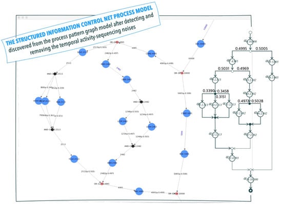 - Kyoung-Sook Kim et al. [] proposed a structured information control net discovery algorithm from process event logs, and firstly introduced the basic concept of so-called deliberate noises with a detection approach. Hyun Ahn et al. [] introduced the theoretical concept of work transference network and its discovery algorithm and framework, which are able to discover a work transference network from process event logs. Additionally, it verified and graphically visualized how the discovered work transference network is affected from noises when the discovery algorithm operates on process event logs embedding noises.