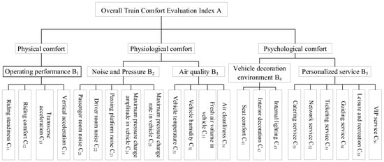 In this paper, the evaluation index system of high-speed train comfort is established by referring to the practical experience of engineering and the research results of existing scholars []. As shown in Figure 2, the top layer is the target layer A, which is the total index to evaluate the comfort of high-speed trains. The middle layer is the criterion layer B, which generally includes three aspects: physical comfort, physiological comfort, and psychological comfort.