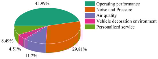 The comfort evaluation of high-speed trains generally shows the trend of physical comfort, physiological comfort, and psychological comfort, as shown in Figure 3. This trend is consistent with the results of the literature research. This shows that the performance of the train itself is the main influencing factor of comfort evaluation, and the proportion of other additional services is relatively small. Among them, the weight of running performance is the largest, indicating that passengers are more intuitive and sensitive to the running performance when riding high-speed trains. The weight ratio of train noise and pressure in the vehicle is second. The real-time data feedback on noise monitoring shows that the focus is on the noise generated during train operation. This is mainly due to the fact that there are 74 new tunnels in the whole Baolan Passenger Dedicated Line restricted by terrain, a total of 272.4 km, accounting for 68% of the length of the line, resulting in aerodynamic noise caused by the high-speed operation of the train in the tunnel most of the time. This is consistent with the research in Reference []. It is worth mentioning that the weight calculation results show that people’s requirements for personalized service quality such as catering, network, and ticket purchase in the process of riding are gradually improving. Therefore, in terms of personalized service, we should adhere to the concept of customer-oriented and comprehensively improve the quality of service.
