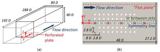 Test section geometry. (a) test section (solid and dashed lines) and numerical domain (solid lines only); (b) perforated plate dimensions. ×: positions of the profiles provided in Figures 10 and 13.