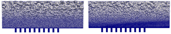 Comparison of original mesh (left) and adapted mesh (right) on a cut along the symmetry plane of the domain, focus on the perforated plate.