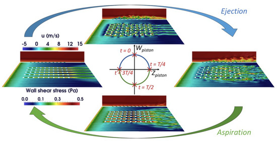 Figure 5 illustrates the flow evolution over a period T of the piston motion, for the lab-scale configuration with no turbulence injection. Upstream of the first row of perforations, the grazing flow boundary layer as well as the wall shear stress present similar evolutions for the four considered instants: the boundary layer thickens, leading to a decreasing wall shear stress. This is characteristic of a classical flat plate. Around the first row of perforations, the flow is then completely disturbed by the synthetic jets and its evolution is no longer comparable to that of a flat plate. Two time phases have to be distinguished: the ejection and suction mid-periods. The ejection mid-period is characterised by the interaction of the jets and the grazing flow boundary layer, which is destabilised by unstable shear layers. The turbulence levels rise and the formation of several coherent flow structures can be observed (cf. Figure 6). Horseshoe vortices are formed upstream of the first perforations, due to a blockage effect, and counter-rotating vortex pairs (CRVP) can be observed downstream the perforations. The greatest observable structures are hairpins, which have been found to interact with the boundary layer and to affect the wall heat transfer [13,14,15,16]. The upstream structures are more coherent than those that are formed downstream, where all the structures interact and the flow transitions to turbulence. The impact of flow structures on the plate can be noticed through the wall shear stress. This impact is similar all along the perforated zone, except for the first row of perforations where the flow is laminar. Contrarily, the aspiration phase is characterised by a heterogenous wall shear stress, and two regions can be identified: the jet axis and the in-between-jets axis. In the jet axis, the boundary layer is sucked through the perforations. A boundary layer is then established after each perforation. This leads to significant wall shear stress. Between jet lines, the flow behaviour is totally different. The decreasing evolution of the wall shear stress corresponds to a thickening boundary layer. Overall, the boundary layer is deeply impacted by the synthetic jets, which, through the wall shear stress modifications, leads to a wall temperature decrease [19].